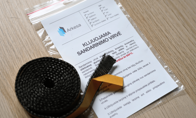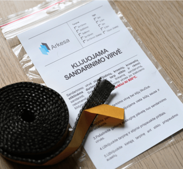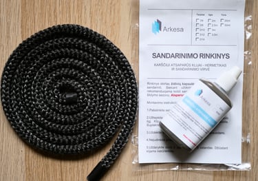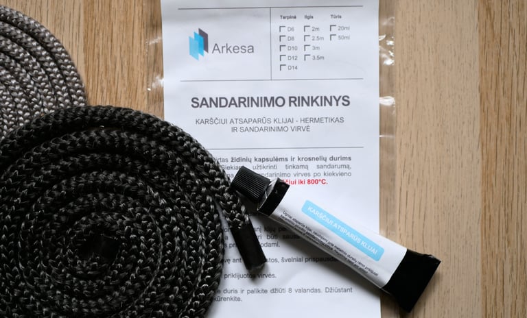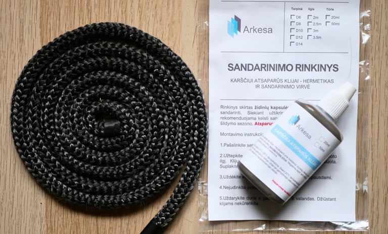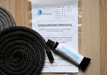 Rinkinyje rasite karščiui atsparius klijus - hermetiką ir sandarinimo virvę.